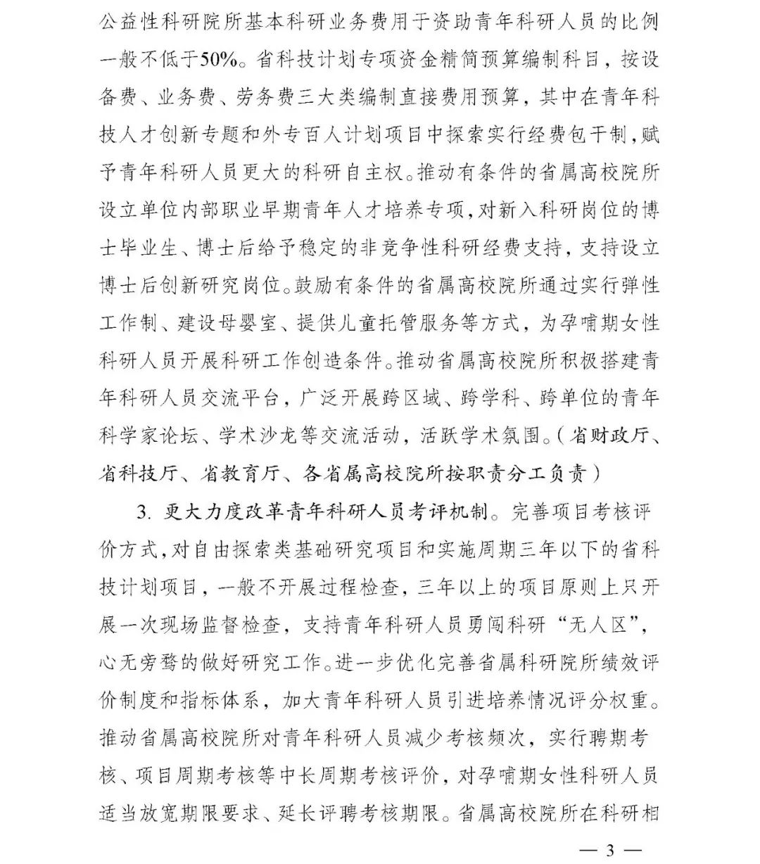 浙江省明确,对于重点攻关项目定期开展检查,一般性课题实施周期内原则上按不超过5%的比例抽查,实施周期三年(含)以下的自由探索类基础研究课题一般不开展过程检查。湖南省等明确对探索性强、研发风险高的前沿领域科研项目,建立尽职免予追责机制。各地明确推动科研单位对青年科研人员减少考核频次,简化、淡化平时考核。
