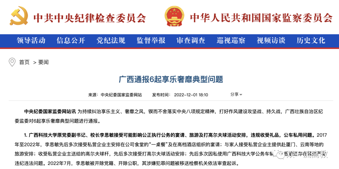 报。2022年6月落马的广西科技大学原党委副书记、校长李思敏腐败细节获披露。排名第一的就是“李思敏接受可能影响公正执行公务的宴请、旅游及打高尔夫球活动安排,违规收受礼品,公车私用问题”。根据通报,2017年至2022年,李思敏先后多次接受私营企业主安排在公司食堂的“一桌餐”及在高档酒店组织的宴请;与家人接受私营企业主提供赴厦门、云南等地的旅游安排;收受私营企业主送给的高尔夫球杆,先后多次接受打高尔夫球活动安排;先后多次因私使用广西科技大学公务车辆。李思敏还存在其他严重违纪违法问题。2022年7月,李思敏被开除党籍、开除公职,其涉嫌犯罪问题被移送检察机关依法审查起诉。公开资料显示,李思敏,男,1963年9月生,汉族,江苏苏州人,2000年1月加入中国共产党,研究生学历,工学博士,教授,博士生导师。李思敏曾任桂林电子科技大学党委常委、副校长,2014年4月任广西科技大学校长、党委副书记。今年6月,广西壮族自治区纪委监委公布了李思敏被查的消息,7月31日中央纪委国家监委网站又公布了李思敏被“双开”的消息。经查,李思敏丧失理想信念,背弃初心使命,逾规越矩,官商勾结,大肆敛财。干扰巡视工作,与他人串供,对抗组织审查;违反中央八项规定精神,收受可能影响公正执行公务的礼品,接受可能影响公正执行公务的宴请、旅游等活动安排,违反公务用车管理规定,公车私用;在组织函询时不如实说明问题;滥用职权,擅自决定多付货款,造成损失;利用职务便利为他人谋取利益,单独或伙同他人非法收受他人财物,数额特别巨大。纪监部门点评:李思敏严重违反党的政治纪律、组织纪律、廉洁纪律,构成严重职务违法并涉嫌受贿犯罪,且在党的十八大后不收敛、不收手,党的十九大后仍不知敬畏、不知止,性质严重,影响恶劣,应予严肃处理。依据《中国共产党纪律处分条例》《中华人民共和国监察法》《中华人民共和国公职人员政务处分法》等有关规定,经自治区纪委常委会会议研究并报自治区党委批准,决定给予李思敏开除党籍处分;由自治区监委给予其开除公职处分;收缴其违纪违法所得;将其涉嫌犯罪问题移送检察机关依法审查起诉,所涉财物随案移送。11月2日上午,来宾市中级人民法院公开开庭审理广西科技大学原党委副书记、校长李思敏受贿一案。该案由来宾市中级人民法院副院长陈洪担任审判长,来宾市人民检察院副检察长李易军出庭支持公诉。公诉机关指控,2015年至2022年,被告人李思敏利用担任广西科技大学党委副书记、校长职务上的便利,为有关公司和私营企业主在项目承揽、设备采购以及工程款拨付等事项提供帮助,与他人共同或单独非法收受上述单位和个人给予的财物共计1596.8633万元,其中未遂298万元。李思敏到案后,如实供述自己的受贿的犯罪事实,退出部分赃款,认罪悔罪并签署认罪认罚具结书。公诉机关提请以受贿罪追究李思敏的刑事责任。庭审中,法庭宣读了庭前会议报告。公诉机关当庭出示了书证、证人证言、被告人供述与辩解等相关证据,被告人李思敏及其辩护人进行了质证,控辩双方在法庭的主持下就案件事实、受贿既未遂、涉案财物处置等问题充分发表了意见,李思敏进行了最后陈述,当庭表示认罪认罚、真诚悔罪。该案将择期宣判。