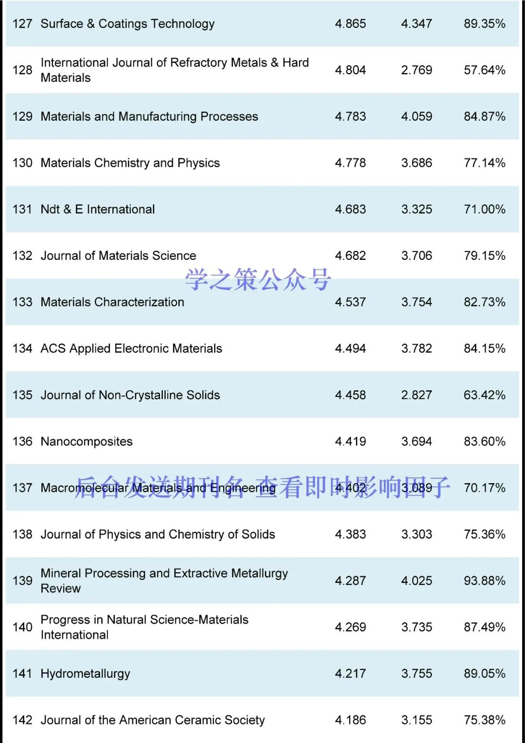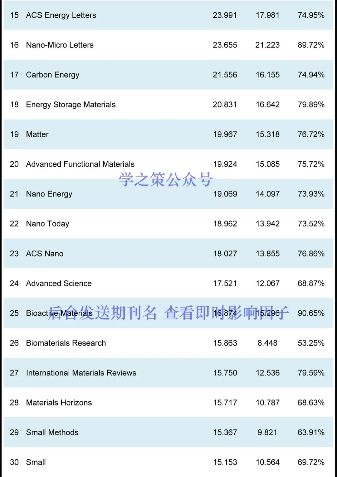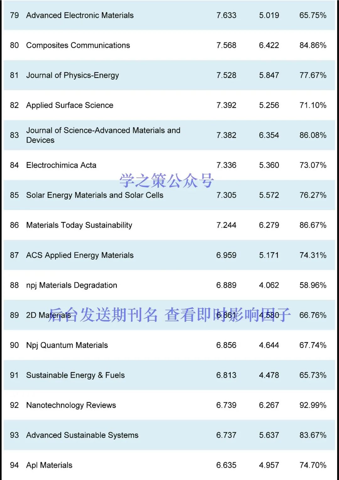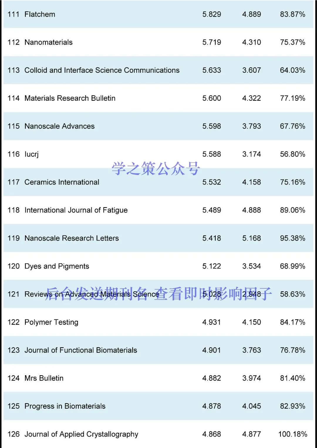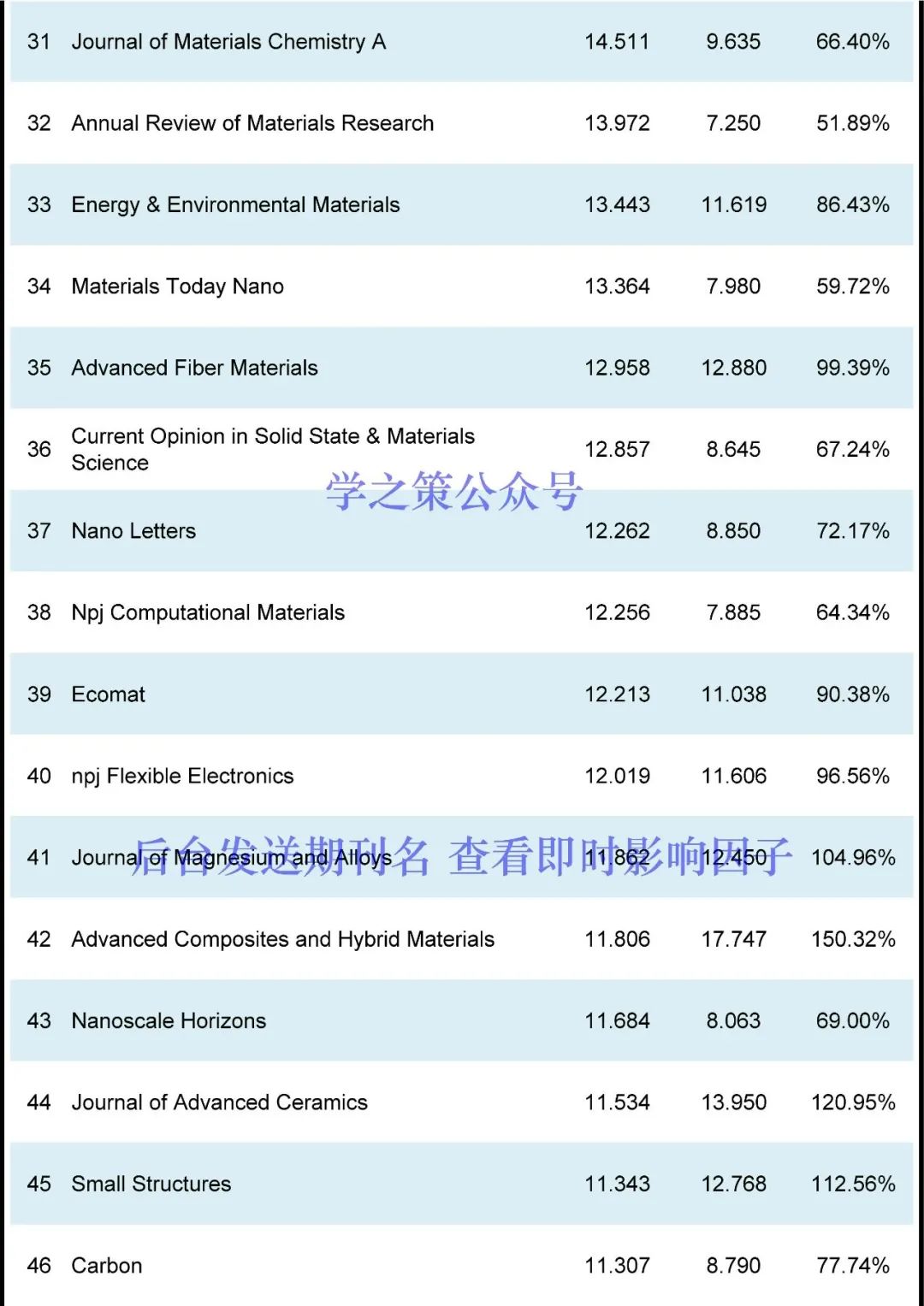本期发布材料期刊(共计422本)的最新即时IF,更多期刊情况,可于学之策公众号后台查询。Nature系列:Nature Reviews Materials即时IF(76.679 → 67.283),完成度87.75%;Nature Energy即时IF(67.439 → 46.162),完成度68.45%;Nature Materials即时IF(47.656 → 33.722),完成度70.76%;Nature Nanotechnology即时IF(40.523 → 31.570),完成度77.91%;Nature Electronics即时IF(33.255 → 27.901),完成度83.90%。顶刊系列:Joule即时IF(46.048 → 32.244),完成度70.02%;Energy & Environmental Science即时IF(39.714 → 26.294),完成度66.21%;Advanced Materials即时IF(32.086 → 23.594),完成度73.53%;Advanced Energy Materials即时IF(29.698 → 22.229),完成度74.85%;Materials Today即时IF(26.943 → 18.655),完成度69.24%;ACS Energy Letters即时IF(23.991 → 17.981),完成度74.95%;Matter即时IF(19.967 → 15.318),完成度76.72%;ACS Nano即时IF(18.027 → 13.855),完成度76.86%;等。国产期刊完成度超过85%的有:Nano-Micro Letters即时IF(23.655 → 21.223),完成度89.72%;Bioactive Materials即时IF(16.874 → 15.296),完成度90.65%;Energy & Environmental Materials即时IF(13.443 → 11.619),完成度86.43%;Advanced Fiber Materials即时IF(12.958 → 12.880),完成度99.39%;Ecomat即时IF(12.213 → 11.038),完成度90.38%;npj Flexible Electronics即时IF(12.019 → 11.606),完成度96.56%;Journal of Magnesium and Alloys即时IF(11.862 → 12.450),完成度104.96%;Journal of Advanced Ceramics即时IF(11.534 → 13.950),完成度120.95%;Journal of Materials Science & Technology即时IF(10.320 → 8.840),完成度85.66%;Journal of Materiomics即时IF(8.589 → 8.112),完成度94.44%;Rare Metals即时IF(6.318 → 7.286),完成度115.32%;International Journal of Minerals Metallurgy and Materials即时IF(3.850 → 4.048),完成度105.13%;等。目前所有材料期刊的平均完成度为77.72%(上个月为68.87%),作为粗略的估计,目前的即时IF除以~0.7,估计比较接近明年的正式IF(个别期刊差异性会比较大)。(注:本文发布的仅为根据IF计算规则得出的当日即时IF,不是最终正式IF的预测。即时IF会一直增长,一般来说,每年3~4月的即时IF会比较接近当年最终IF。)