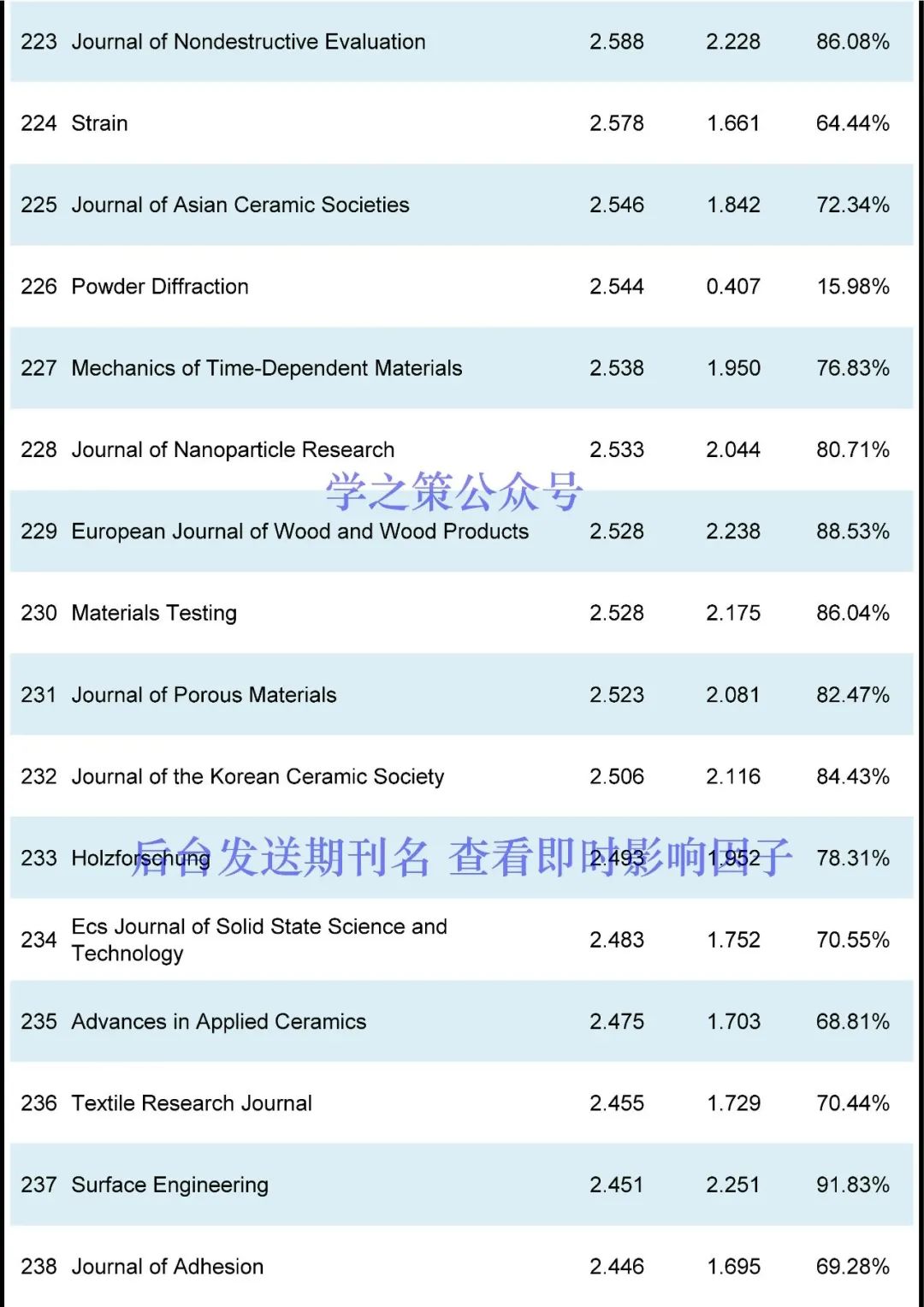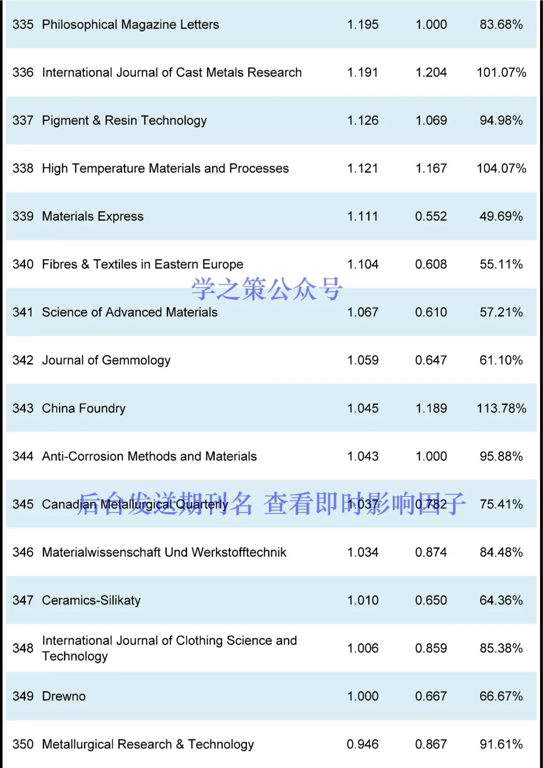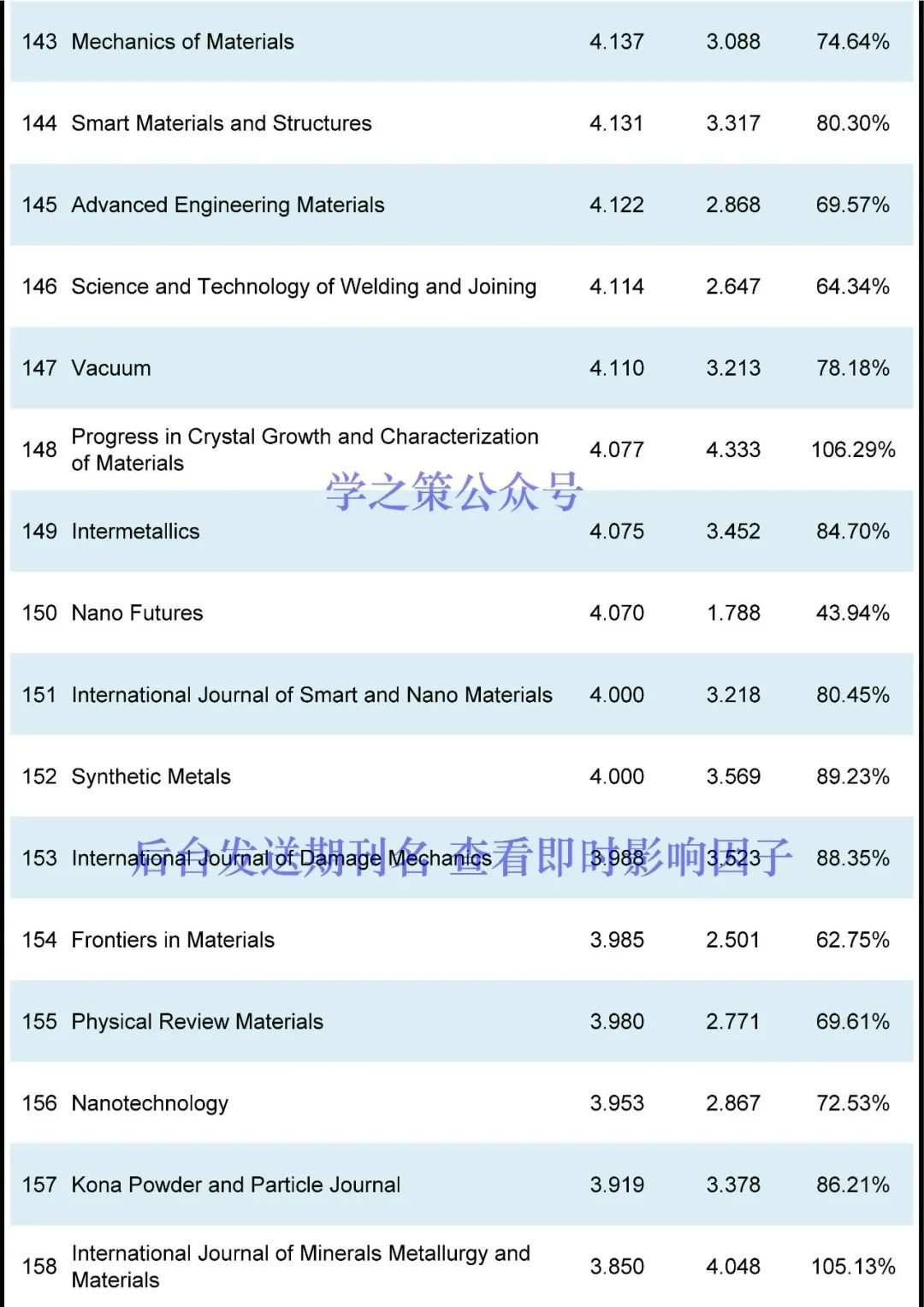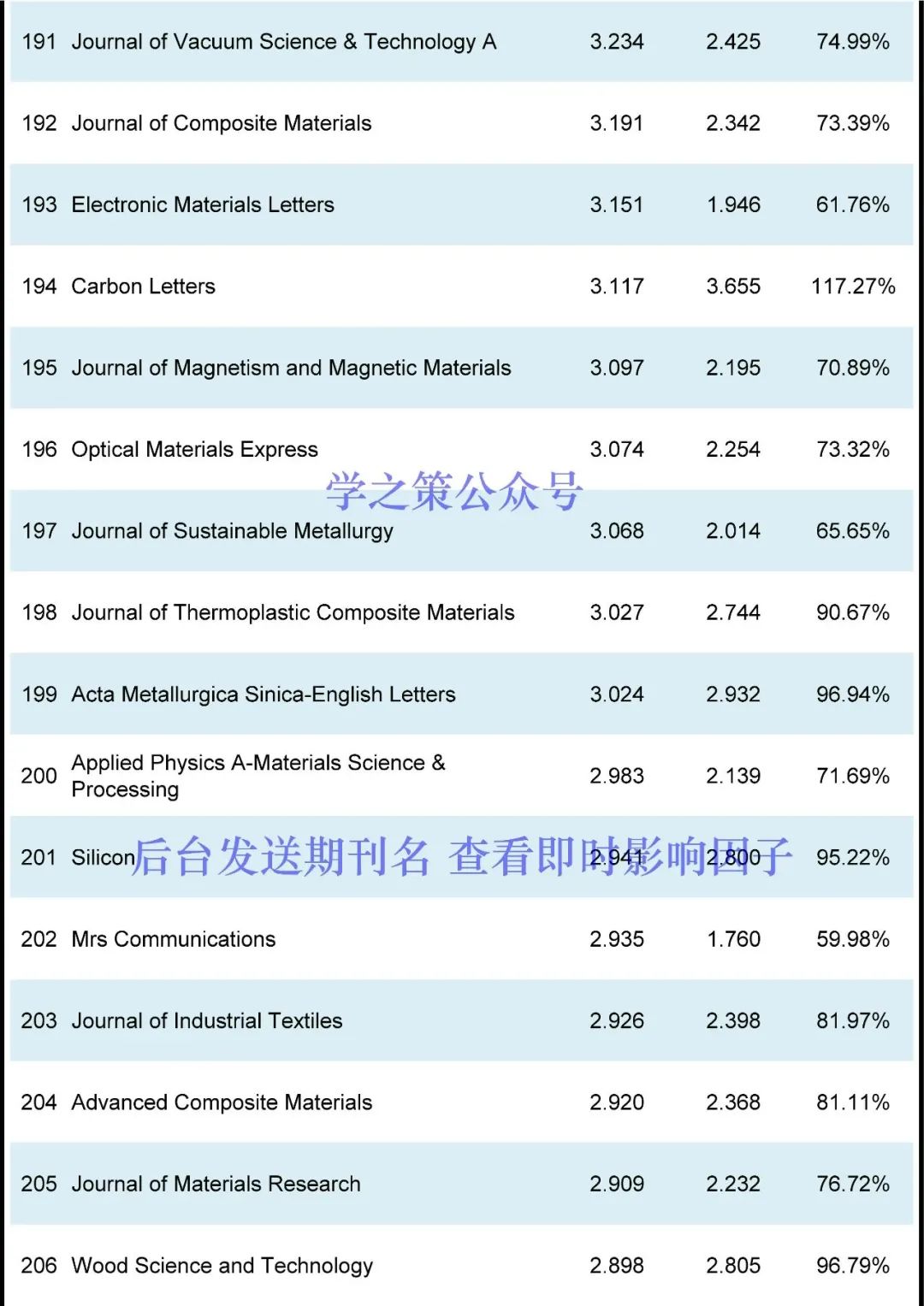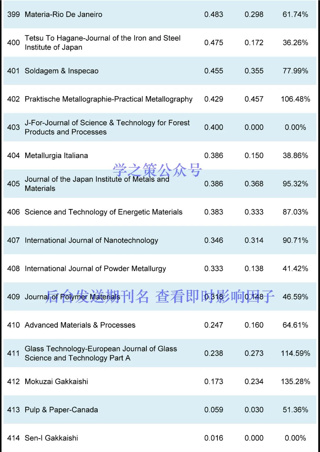 本期发布材料期刊(共计422本)的最新即时IF,更多期刊情况,可于学之策公众号后台查询。Nature系列:Nature Reviews Materials即时IF(76.679 → 67.283),完成度87.75%;Nature Energy即时IF(67.439 → 46.162),完成度68.45%;Nature Materials即时IF(47.656 → 33.722),完成度70.76%;Nature Nanotechnology即时IF(40.523 → 31.570),完成度77.91%;Nature Electronics即时IF(33.255 → 27.901),完成度83.90%。顶刊系列:Joule即时IF(46.048 → 32.244),完成度70.02%;Energy & Environmental Science即时IF(39.714 → 26.294),完成度66.21%;Advanced Materials即时IF(32.086 → 23.594),完成度73.53%;Advanced Energy Materials即时IF(29.698 → 22.229),完成度74.85%;Materials Today即时IF(26.943 → 18.655),完成度69.24%;ACS Energy Letters即时IF(23.991 → 17.981),完成度74.95%;Matter即时IF(19.967 → 15.318),完成度76.72%;ACS Nano即时IF(18.027 → 13.855),完成度76.86%;等。国产期刊完成度超过85%的有:Nano-Micro Letters即时IF(23.655 → 21.223),完成度89.72%;Bioactive Materials即时IF(16.874 → 15.296),完成度90.65%;Energy & Environmental Materials即时IF(13.443 → 11.619),完成度86.43%;Advanced Fiber Materials即时IF(12.958 → 12.880),完成度99.39%;Ecomat即时IF(12.213 → 11.038),完成度90.38%;npj Flexible Electronics即时IF(12.019 → 11.606),完成度96.56%;Journal of Magnesium and Alloys即时IF(11.862 → 12.450),完成度104.96%;Journal of Advanced Ceramics即时IF(11.534 → 13.950),完成度120.95%;Journal of Materials Science & Technology即时IF(10.320 → 8.840),完成度85.66%;Journal of Materiomics即时IF(8.589 → 8.112),完成度94.44%;Rare Metals即时IF(6.318 → 7.286),完成度115.32%;International Journal of Minerals Metallurgy and Materials即时IF(3.850 → 4.048),完成度105.13%;等。目前所有材料期刊的平均完成度为77.72%(上个月为68.87%),作为粗略的估计,目前的即时IF除以~0.7,估计比较接近明年的正式IF(个别期刊差异性会比较大)。(注:本文发布的仅为根据IF计算规则得出的当日即时IF,不是最终正式IF的预测。即时IF会一直增长,一般来说,每年3~4月的即时IF会比较接近当年最终IF。)