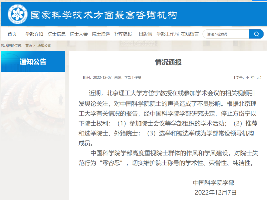 近期,北京理工大学方岱宁教授在线参加学术会议的相关视频引发舆论关注,对中国科学院院士的声誉造成了不良影响。根据北京理工大学有关情况的报告,经中国科学院学部研究决定,停止方岱宁以下院士权利:(1)参加院士会议等学部组织的学术活动;(2)推荐和选举院士、外籍院士;(3)选举和被选举成为学部常设领导机构成员。