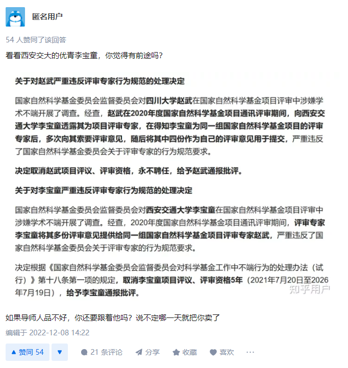近日,有网友提问:“导师涉嫌学术不端被基金委取消评议评审资格并通报批评,这个严重吗?会影响到学术前途吗?”该话题引起了众多回复。