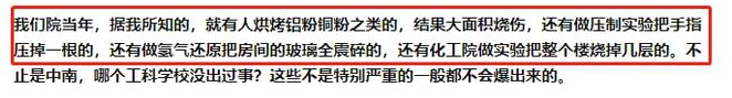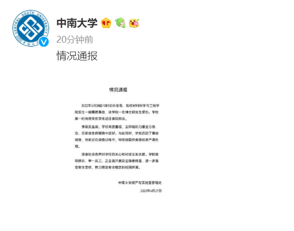 有目击事件的学生指出,有看过网上流传的文章,但认为文章夸大了事件的部份细节。他说女事主流脓的部位应为面部皮肤,又称医院检查后指不会造成永久创伤,康复约需时几个月至一年,操作实验失当的男博士研究生已向伤者道歉,亦有探望及慰问伤者,又说女事主现时正在家休息,得知不会造成永久创伤后,近日心情已渐趋稳定。发生这样的事情令人痛心,对于生化环材专业的学生来说,做实验是不可避免的,而很多实验本身就有很大的危险性。2022年4月20日,中南大学实验室内发生爆燃事故,该校材料科学与工程学院一博士生在事故中大面积烧伤,事故具体原因尚不知晓。但据网友爆料,伤者在做实验时由于高温金属粉末进入气管和食道,覆盖全身80%以上的皮肤持续燃烧,皮肤大面积烧伤。目前实验室已封闭。2022年4月27日,中南大学发布了对本次事故的情况通报,学校已启动事故调查,将根据最终调查结果严肃处理。2021年10月24日,南航实验室发生爆炸,共造成2人死亡,9人受伤。而此次事故,使得高校实验室安全问题再一次成为讨论热点。不少网友对这名受伤的博士生十分心疼:“花多少心血才能出一个博士,熬多久才能发完sci,本来今年博士毕业。”2015年12月,北京某高校化学系一间实验室发生爆炸事故,1名正在做实验的博士后当场死亡。事故原因在于实验过程中氢气泄漏,而实验人员并未发觉,实验涉及到的高温环境引发了氢气爆炸。2013年4月,南京某高校一处废弃实验室发生爆炸,事故造成1死3伤。事故发生直接原因是外来施工人员用明火切割金属,而该废弃实验室是10多年前存放化学药品的实验室。废弃了10多年的实验室,还存放有危险化学品,可以说这起事故,与危险化学品管理疏忽不无关系。把记忆拉回2018年12月,北京某高校在进行垃圾渗滤液污水处理科研实验期间,实验现场发生爆炸,3名参与实验的学生死亡。这起事故直接原因在于,反应过程中产生了易燃气体氢气,由金属摩擦及碰撞产生的火花点燃而发生爆炸,爆炸的同时造成了镁粉粉尘爆炸和其他可燃物的剧烈燃烧。事故认定这是一起责任事故,其中根本原因就在于对科研项目安全管理的不到位。实验室里发生的危险,往往就在于一点一滴的小细节上,而正是因为如此,才更需要大家打起十二分的警惕!对于导师而言,应该对学生手把手进行培训,万万不可在这上面省事。并且,如果可以的话国内高校也有必要引入国外大学的经验。首先,教授在提交实验项目时,必须附带实验风险评估报告,由专业部门审核批准。目前,国内许多学者在进入实验室时,只关心项目带来的意义、影响,没有考虑到实验本身的风险因素,这是一个盲点。其次,高校应配备更多的专业人员,参与实验室安全保护,国外一些知名的化学品企业及高校,安全人员人数甚至超过了研究人员。对于学校而言,全校实验室安全检查不能浮于表面,要落到实处,在这一点上,有的高校还直接成立了专门的部门,比如像华东理工大学,其作为国内成立最早、规模最大的化工类院校。具有一定危险性的化学实验室超过了总数的2/3。为此,华理制定了一系列实验室“军规”,仅涉及实验室安全的文件就达10多项。同时,华理成立了一个专门的部门,负责全校实验室安全检查。而对于同学们来说,实验室安全隐患多多。进入实验室后,不仅要关注自己的实验,按规定进行操作,还要做到眼观六路、耳听八方,为自己和他人的生命着想。实验室安全准则要牢记心中并遵守,自己做实验时要谨慎小心,不要眼高手低。最后,希望大家都能平平安安做实验、顺顺利利到毕业。