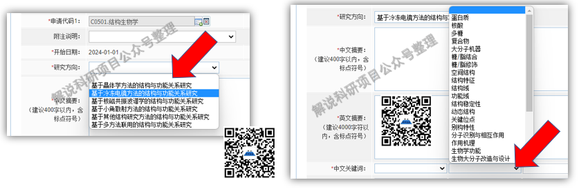 另外,与去年相似,在选定代码后,部分学科还会有选择“研究方向”:选定研究方向后,中文关键词也会有选项(NSFC系统提供的),供大家使用(截止到2023年1月16日15:45)!这时,前两个代码不能自己填写!