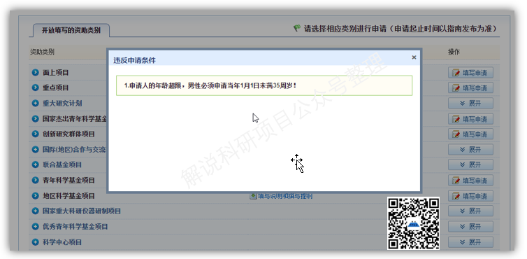 如果已经超出青年项目的申请年龄,NSFC会有提示的,下图为已经超出青年项目的申请年龄时的提示。