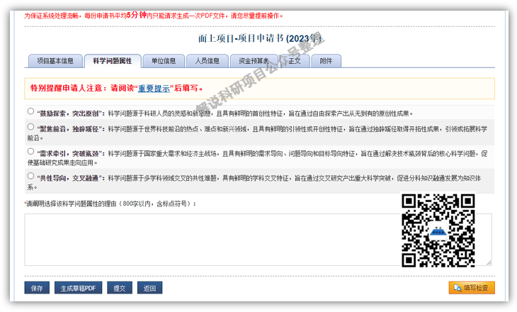 3、网上填报的申请书,分为如下几项:项目基本信息、科学问题属性、单位信息、人员信息(青年项目无参与人员)、资金预算表、正文、申请人研究成果、附件。