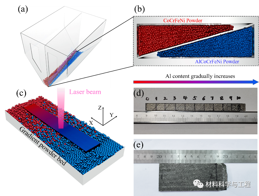 近年来,高熵合金(High-entropy Alloys , HEAs)凭借其独特的多主元合金化策略被证明有助于实现出色的材料力学、耐腐蚀、耐低温损伤的综合性能,但由于传统的试错法无法在可用的时间内评估如此大量的合金成分体系,因此如何在如此广泛的成分空间寻找可靠的HEAs是工程领域所面临的重大挑战之一。已有部分学者运用高通量的理念结合粉末冶金、激光定向沉积、共靶磁控溅射等技术制备出了具有成分梯度变化的小型合金块体与薄膜材料,基于硬度数据来支持HEASs的高通量成分筛选工作,但由于成分控制精度较低且制备试样外形及尺寸有限,难以满足工程结构领域获取材料精确地力学性能数据的核心诉求。近日,北京科技大学曲选辉、张百成研究团队提出了一种新的高通量激光粉末床熔融(LPBF)系统,以实现连续成分梯度高熵合金制备,来检查AlxCoCrFeNi(x = 0.04-0.75)体系中无裂纹且力学性能表现良好的成分范围。实验结果表明,当x<0.7时,无裂纹制造是可能的。该成分范围超过了最近文献中报道的阈值。微观结构表征揭示了在LPBF的极冷凝固中,Al成分主导的相变促使柱状晶粒向构建方向的近等轴晶粒过渡,形成独特的双相分层微结构,可以有效抑制金属增材制造中热裂的引发和扩展。双相区合金在形变过程中得益于由软硬相组成的非均质微观结构所带来的背应力强化作用,实现了500Hv的高硬度,750MPa的极限拉伸强度,以及约20%的优异延伸率。本研究为今后利用激光增材制造制备特定成分的高性能高熵合金构件提供了成分选择的空间和实践路径。相关工作以“Effect of dual phase structure induced by chemical segregation on hot tearing reduction in additive manufacturing”为题发表在《Materials & Design》上,并被选为封面文章。北京科技大学的张百成副教授为论文通讯作者,郭朝阳为论文第一作者,新加坡南洋理工大学的魏思远博士为共同第一作者,新加坡科技研究局的王沛研究员和南洋理工大学的Upadrasta Ramamurty 教授也参与了本课题的研究。https://www.sciencedirect.com/science/article/pii/S0264127523002629图1(a–c)本研究中使用的自主开发的LPBF装置示意图;(d–e)制造样品的照片。成分分级的AlxCoCrFeNi合金(x是Al的摩尔比)是利用两种等原子比CoCrFeNi和AlCoCrFeNi预合金粉末使用自主设计的LPBF系统制造的,其中通过分离粉末供应料斗来实现连续成分分级,如图1(a-c)所示。在多次试验所权衡后的工艺参数:扫描速度714mm/s,激光功率295W,层厚50μm,扫描间距120 μm下,获得了打印态梯度试样用作表征和拉伸实验,如图1(d-e)所示。图2(a)梯度AlxCoCrFeNi HEAs沿GD的相对致密度和(b)成分分布。图2(a)显示除了Al含量相对较高的区域(16 at.%)外,在分级合金中未发现裂纹,并且观察到相对密度高于99.5%。从图2(b)中可以看出,试样整体具有相对平滑的成分梯度,Al的变化范围为1-16at%(x=0.04–0.75)。由于Al的低熔点/蒸发点,在整个梯度方向上中存在Al损失。图3(a)AlxCoCrFeNi成分分级的11个区域的XRD衍射图;(b)FCC(2 0 0)峰值的偏移用虚线突出显示;(c)通过MAUD拟合(虚线)和EBSD统计(实线)计算的相对于Al含量的相比例变化。图3(a-b)的XRD结果显示Al含量的梯度变化引起了打印态CoCrFeNi基体相结构的渐进式转变:FCC→FCC/BCC →BCC,衍射峰出现向低角度的偏移行为,描述了晶格随Al含量变化的畸变程度。MAUD对XRD的精修拟合提供了两相比例的定量理解,如图3(c)所示。