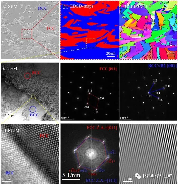 图5(a)双相区样品的代表性SEM图像和更高放大率(b)相和(c)取向图;(d)双相的典型TEM亮场图像及其相应的SAED图案(e–f);(g)FCC/BCC相之间界面的高分辨率TEM(HRTEM)亮场图像和(h)相应的快速傅立叶变换(FFT)图案,显示了两相之间的取向关系;(i)反向FFT图。图5显示了对双相合金的特殊组织进行的TEM分析结果,在 BCC 区域中注意到超晶格的衍射图案,存在具有 B2 晶体结构的有序相,两相具有[0 1 1] FCC/[1 1 1]BCC的 K-S取向关系,界面为具有晶格错配的半共格界面。