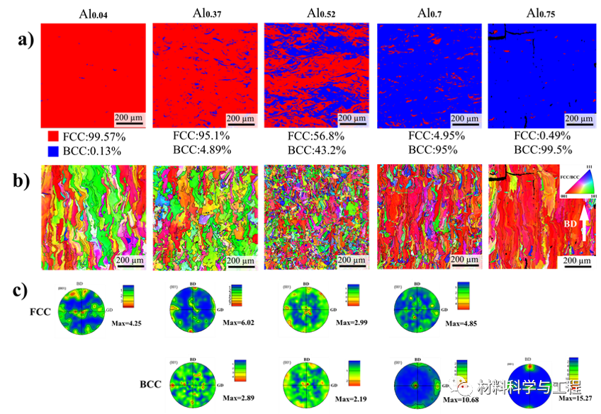 图4(a)沿GD的梯度AlxCoCrFeNi HEAs的相变化、(b)取向图和(c)代表性区域的极图。图4EBSD结果显示FCC/BCC相位比例统计结果与Maud拟合结果具有一致性。双相区由细小的类等轴晶组成,晶粒形态受相成分影响,织构取向相对于单相区明显变弱。