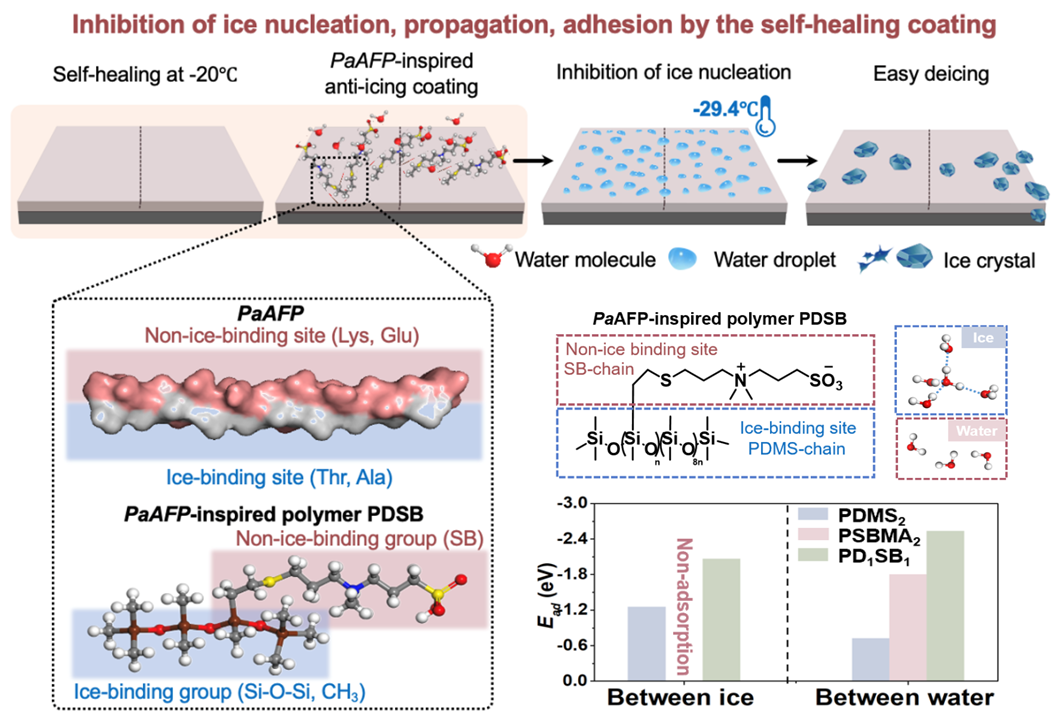 用于户外基础设施表面的防冰涂层在露天场景下不可避免受到如冰雹、沙尘暴、高空异物等撞击,导致表面发生严重的机械损伤,降低防冰涂层的使用寿命。同时机械损伤对于涂层的防/除冰性能的可能产生的负面影响也缺乏深入的研究讨论。如何理解并克服机械损伤对于防冰涂层的影响是防冰领域面临的关键难题。开发具有自主愈合能力、克服机械损伤,能够实现户外长效防除冰的新型防冰涂料对于实际应用具有重要意义。天津大学化工学院张雷、杨静团队长期从事自愈合、防冰抗冻材料的研究,团队开发的基于多重动态键的“全天候”自愈合材料首次实现了在低温、水下、强酸/碱等极端环境的自主自愈合(Nat. Commun. 2020, 11, 2037),之后团队将该材料与氟化石墨烯结合,制备出自愈合光热防冰涂层(Small 2023, 19, 2206075)应用于实际防/除冰工作。① 天大团队首次揭示机械损伤对涂料防/除冰性能的影响机制近日,天津大学化工学院张雷、杨静团队在Science合作期刊《Research》(IF=11.036)上发表了题为“Inhibition of Defect-Induced Ice Nucleation, Propagation, and Adhesion by Bioinspired Self-Healing Anti-Icing Coatings”的研究论文。首次系统地揭示了涂料表面机械损伤对涂料防除冰性能的影响机制,并提供了一种在低温下可自主自愈合的仿生防冰涂料。天津大学化工学院博士研究生田澍为论文的第一作者,张雷教授和杨静副教授为通讯作者,天津大学化工学院为第一单位,合作单位为滨州魏桥国科高等技术研究院。该研究得到了国家自然科学基金的支持。该工作首先通过实验配合理论计算,探究了涂料损伤缺陷处的结冰过程。通过高速摄像观察到,低温下缺陷处优先产生冰晶进而扩散至整个水滴完全结冰。已冻结的水滴会以缺陷为“桥梁”,向邻近水滴进行冰晶的扩散传递,最终使相邻水滴冻结。通过第一性原理和有限元计算发现,涂料缺陷处与水分子的吸附能力更强、传热速度更快,因此冷凝水更容易在缺陷处成核结冰。另外,缺陷处结冰后会与冰形成嵌入式“互锁结构”,增加了冰在涂料表面的粘附强度和除冰难度。缺陷诱导冰成核、传递、粘附的过程如图1所示。值得注意的是钢板表面冰成核温度是-13.6℃,而损伤后涂料表面冰成核温度为-9.5℃,说明损伤使涂料从“防结冰”变为“促结冰”。图1 缺陷诱导涂料表面冰成核、扩散传递以及冰粘附行为和机制该团队研究挖掘了天然抗冻蛋白的关键抗冻模块(冰结合位点IBS与非冰结合位点NIBS),通过模拟IBS与NIBS抗冻模块,构建了仿抗冻蛋白聚合物PDSB,并加入到自愈合材料基质中,制备了兼具优异防结冰和易除冰性能的自愈合防冰涂料。该防冰涂料通过PDSB的“NIBS”模拟模块结合水分子,降低表面冰非均相成核温度,通过“IBS”模拟模块抑制冰晶扩散传递,提高了涂料的防结冰性能。结果表明,与钢板相比,该涂料的冰成核温度降低了-15.8℃、结冰延迟了48.4倍、冰扩散速度下降两个数量级。此外,涂料通过低表面能结构以及两性离子SB链段与界面水分子形成的不冻结水,降低了涂料的冰粘附强度,提高了涂料的除冰性能,冰粘附强度仅为空白钢板的1/23(图3)。④ 多重动态键实现涂料低温下自主自愈合及户外长期使用该涂料通过材料分子结构中的强氢键、弱氢键、二硫键以及静电相互作用实现优异的低温自愈合性能,表面损伤缺陷在-20℃下可实现自主愈合,愈合后的力学性能、防结冰性能(成核温度、结冰延迟时间)以及除冰性能(冰粘附强度)均得到良好的恢复,从而有效抑制缺陷诱导的冰成核、传递和冰粘附。该工作与目前国际上已报道的防冰涂料相比,不仅可以在低温下自主愈合,还可以同时抑制冰成核、传递和粘附,具有环境适应性和大规模涂装潜力,为应用于户外易损伤环境下防冰涂料的研发提供了新思路(图4)。图4 仿生自愈合防冰涂料-20℃下的自愈合性能及同已报道的防冰涂料性能对比张雷,天津大学化工学院生物化工系教授、系主任、博士生导师,国家自然科学基金优秀青年基金获得者。主要研究方向包括生物化工与合成生物学、低温保护、功能材料、防冰涂料等。已在Nature Biotechnology, Nature Communications, JACS, Angew, Chemical Reviews, AIChE Journal, CES, Research, Engineering等期刊发表论文100多篇。杨静,天津大学化工学院副教授、博士生导师。主持国家级重点项目、国家自然科学基金、天津市基金、教育部博士后基金等项目。主要研究方向为细胞保存、仿皮肤材料、合成生物学等。已在Nature Communications, Research, Advanced Functional Materials, Chemical Reviews, AIChE Journal等刊物发表第一作者/通讯作者SCI论文40余篇。田澍,天津大学化工学院博士研究生。主要研究方向为功能防护涂料开发与应用。目前以第一作者/共同第一作者身份在Research, Small, CES, Chemical Engineering Journal, Biosensors & Bioelectronics, ACS Sustainable Chemical & Engineering, ACS Applied Materials & Interfaces等期刊发表论文10余篇。