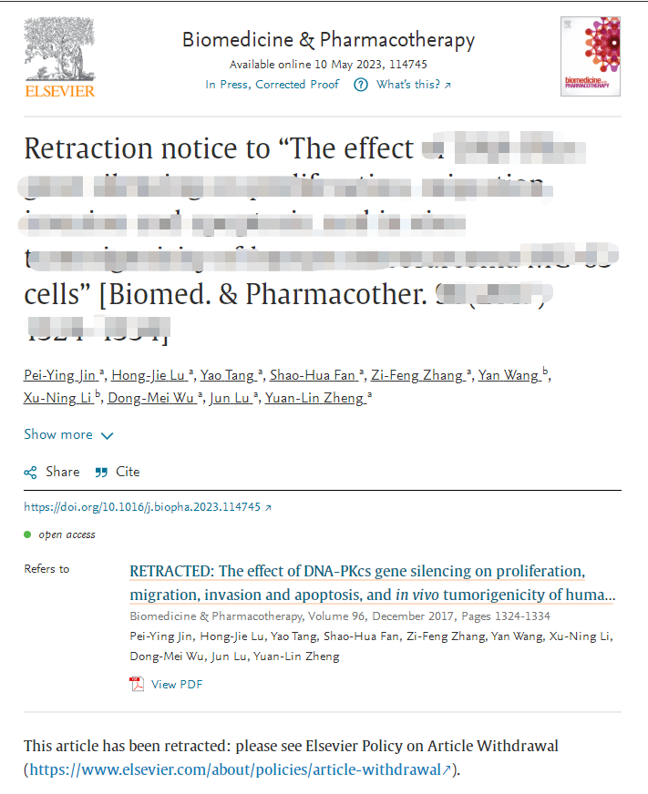 于2023年5月10日,江苏师范大学郑元林、陆军及吴冬梅共同通讯在Biomedicine & Pharmacotherapy 在线发表研究论文,该文章被撤回,主要原因是不同文章涉嫌图片重复使用。该研究表明的是,DNA-PKcs的沉默抑制MG-63细胞的增殖、迁移和侵袭,同时促进细胞凋亡和裸鼠骨肉瘤的生长。