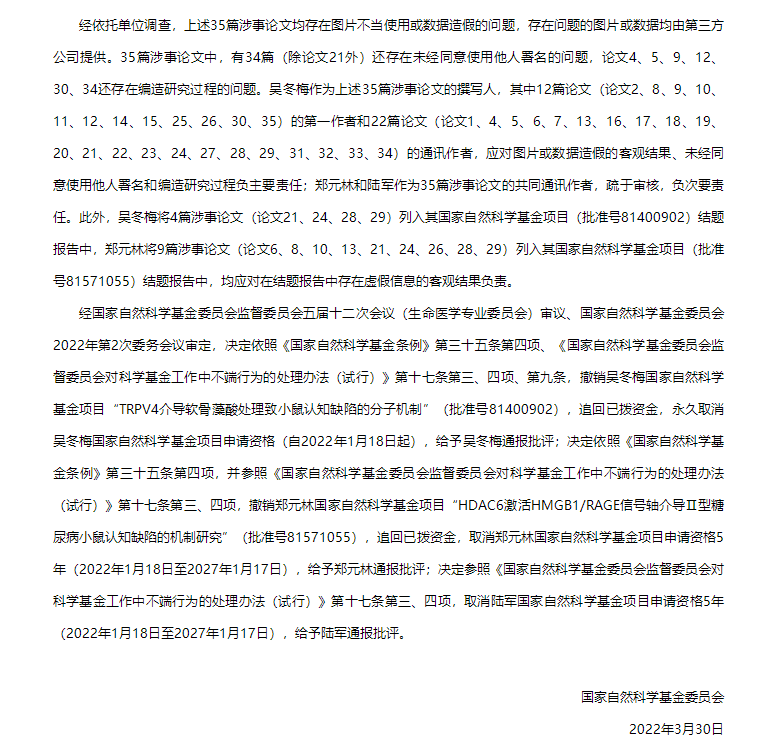 经国家自然科学基金委员会监督委员会五届十二次会议(生命医学专业委员会)审议、国家自然科学基金委员会2022年第2次委务会议审定,决定依照《国家自然科学基金条例》第三十五条第四项、《国家自然科学基金委员会监督委员会对科学基金工作中不端行为的处理办法(试行)》第十七条第三、四项、第九条撤销吴冬梅国家自然科学基金项目“TRPV4介导软骨藻酸处理致小鼠认知缺陷的分子机制”(批准号81400902),追回已拨资金,永久取消吴冬梅国家自然科学基金项目申请资格(自2022年1月18日起),给予吴冬梅通报批评;决定依照《国家自然科学基金条例》第三十五条第四项,并参照《国家自然科学基金委员会监督委员会对科学基金工作中不端行为的处理办法(试行)》第十七条第三、四项,撤销郑元林国家自然科学基金项目“HDAC6激活HMGB1/RAGE信号轴介导Ⅱ型糖尿病小鼠认知缺陷的机制研究”(批准号81571055),追回已拨资金,取消郑元林国家自然科学基金项目申请资格5年(2022年1月18日至2027年1月17日),给予郑元林通报批评;决定参照《国家自然科学基金委员会监督委员会对科学基金工作中不端行为的处理办法(试行)》第十七条第三、四项,取消陆军国家自然科学基金项目申请资格5年(2022年1月18日至2027年1月17日),给予陆军通报批评。