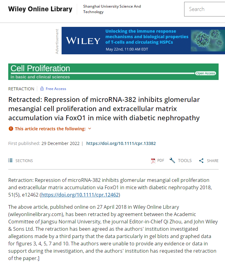 而在2022年12月29日,Wiley发表了一篇撤稿通知,2018年4月27日发表于Wiley在线图书馆上的论文,经江苏师范大学学术委员会、杂志主编Qi Zhou和约翰·威利父子出版公司同意,文章已被撤回。