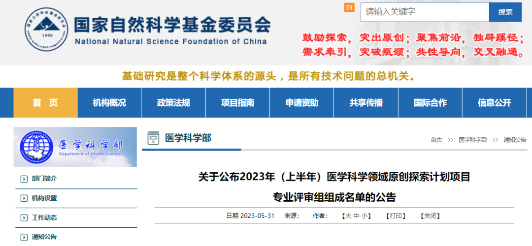 关于公布2023年(上半年)医学科学领域原创探索计划项目专业评审组组成名单的公告