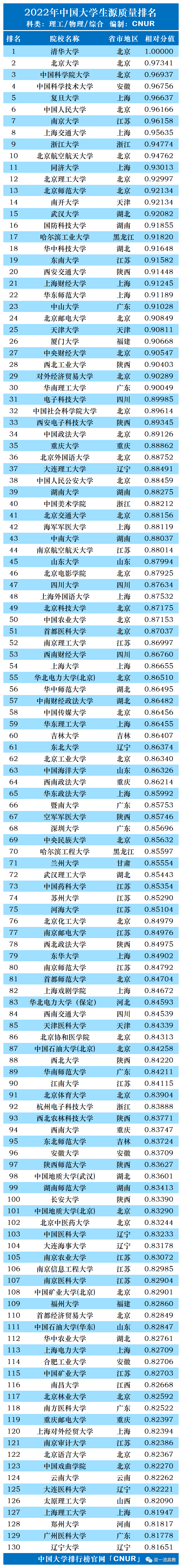 2022年中国大学生源质量排名理工类TOP130