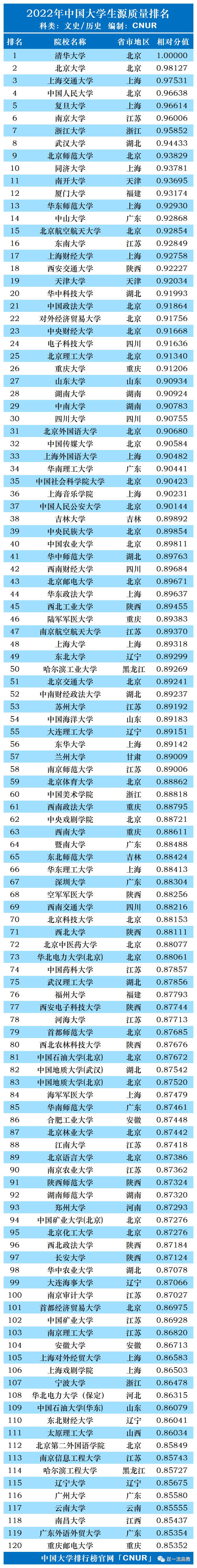 2022年中国大学生源质量排名文科类TOP120