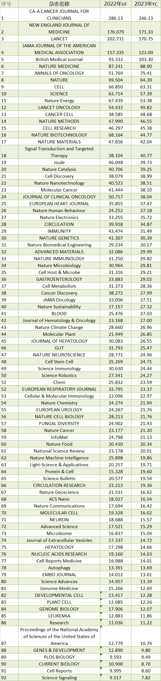 比较关注的一些专刊,比如:CA 杂志的影响因子会从286下降到246,Blood 从25上升到27,Molecular Cancer 从41降到38;Cancer Discovery 从38降到28;由于篇幅有限,我们列出了所有预测的92个杂志。由于时间比较匆忙,如有错误,可及时告知iNature编辑部。另外,此次影响因子预测,仅供参考,不作为最后的影响因子结果。