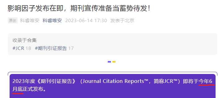 6月14日,科睿唯安公众号更新文章,提到:今年的2023年度期刊引证报告(Journal Citation Reports™,简称JCR™)即将于6月底正式发布!