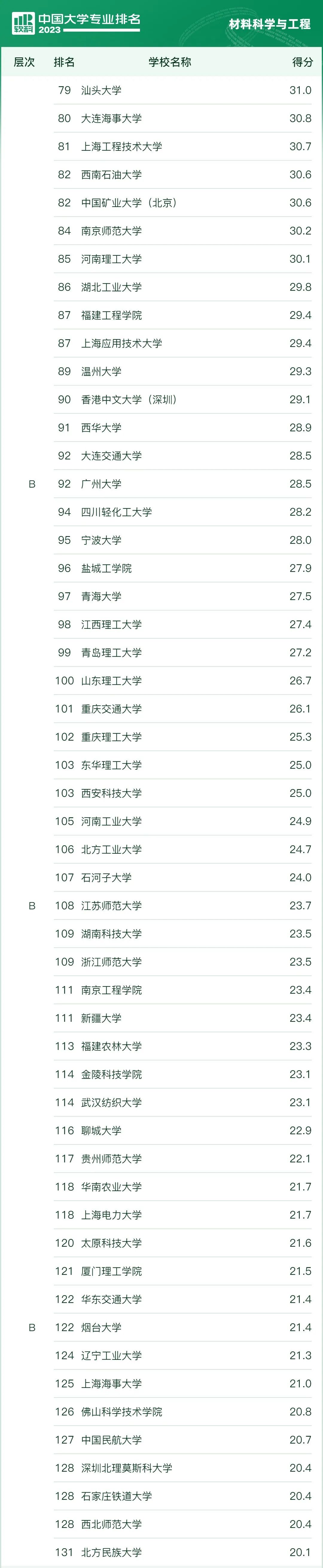 “学校条件”考察一所大学的经费收入、师资规模、师资结构、教授授课等学校层面的培养条件,结果用于学校开设的所有专业; “学科支撑”考察专业关联学科的水平和实力,一个学科对与其关联密切的专业均有支撑作用; “专业生源”即专业录取新生的高考成绩,反映了该专业的社会声誉和对学生的吸引力; “专业就业”体现了专业的毕业生被社会认可和接纳的情况; “专业条件”考察本专业的模范师生、思政教育、一流课程、优秀教材、教学成果、教改项目、平台基地等专业层面的培养条件以及本专业获得的各种认证和重点建设情况。 材料科学与工程专业排名结果如下: