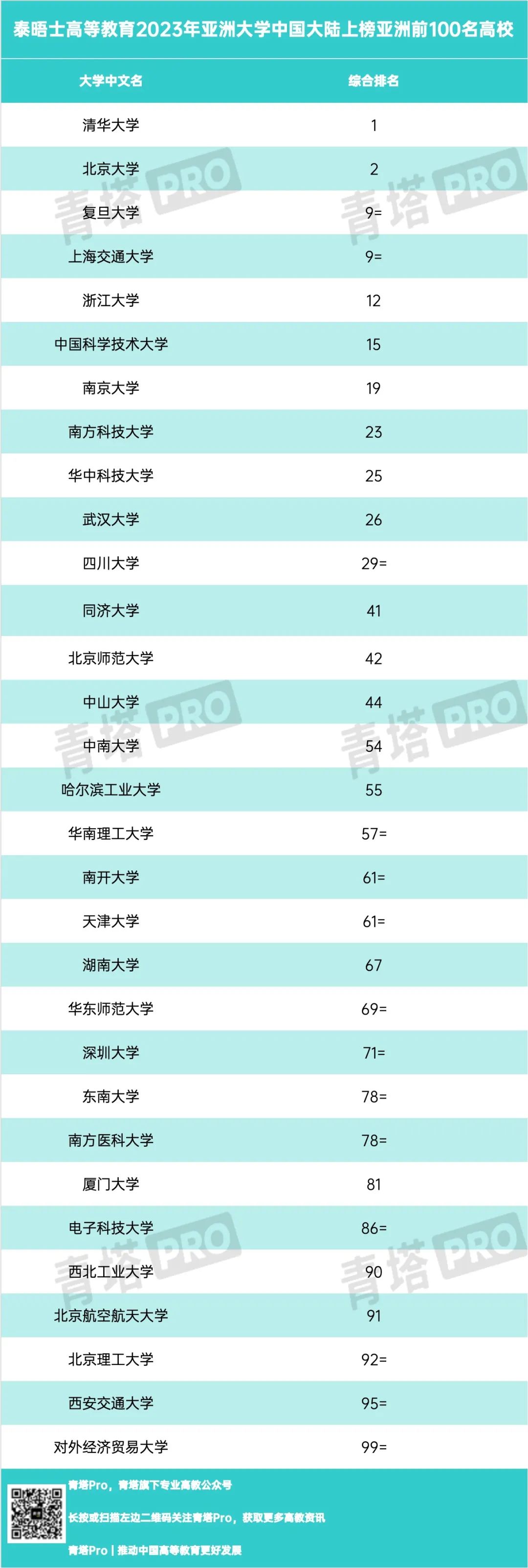 2023泰晤士亚洲大学中国大陆上榜亚洲前100名高校如下: