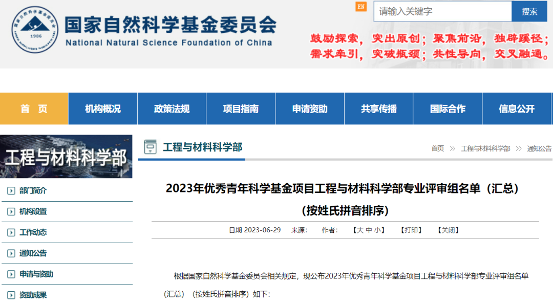 2023年国家杰出青年科学基金项目工程与材料科学部专业评审组名单(汇总)