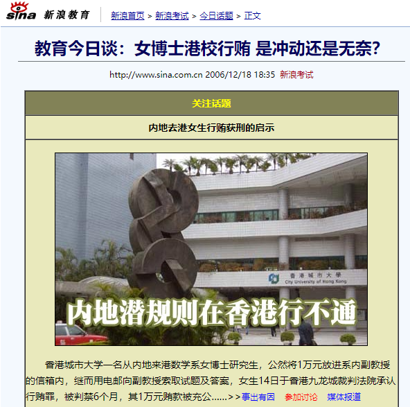 读博第三年,写不完论文开题报告,想通过贿赂导师让自己顺利毕业?这样震惊的操作,电视剧可能都不好意思这么演,现实却发生了......7月4日,据澳门特区政府廉政公署官网消息,澳门大学教授实名举报其博士生意图行贿,以争取在撰写论文前开题报告能获得通过,确保能顺利毕业。澳门廉署称其涉嫌触犯澳门《刑法典》中的行贿罪,案件已移送检察院处理。涉案的这位内地博士生,在澳大法学院读博,按校方规定,如果他未在入学第3年结束前完成开题报告,会被勒令退学。在限期届满前,该生的指导教授在个人信箱内,发现自己送给博士生的书里面夹有装着一沓现金的红色信封,随即联系校方行政人员一同约见该博士生,该博士生承认这些现金是打算给予指导教授。据悉,过去该博士生也曾在入读澳大后,想要送指导教授数千元的购物礼券,但被严正告诫及拒绝。网友:意图行贿导师这件事,看来是“早有前科”、屡教不改啊...2006年12月15日,一名湖北籍学生陈静,入读香港城市大学数学系哲学博士,在数学系课程准备举行期末考的时候,她准备了一个装有1万元现金的信封,放到了该系副教授戴晖辉的城大邮箱里。同日戴晖辉收到了一封匿名电邮 ,对方(后证实是被告)声称是该课程的学生,亦是将现金放入邮箱的人。5日后,戴再收到被告寄给他两封电邮,催促他将试题及答案交予她。戴晖辉出生于内地,1984年浙江大学力学系毕业后赴英国、加拿大留学,1995年进香港城市大学任教,数学系副教授,专长应用数学及计算数学等。收到钱和匿名电邮后,戴晖辉与系主任周定轩商量,随后向校方高层汇报,校长张信刚等高层认为事态严重,决定向廉署举报。“我是第一时间向学校汇报,没有过一分钟犹豫。”戴晖辉说,“匿名送钱和用匿名电邮索要试题和答案,在香港已构成犯罪事实。若认同这一前提,我所做的,就是再正常不过。”其后,戴在廉署指示下,相约被告在咖啡店见面,表示会让被告查看有关试题及答案。而被告更要求戴带备空白的答题簿,让她抄下答案。被告赴会并确认自己是撰写匿名电邮的人。戴随即把预先准备的试题、答案、两本空白答题簿交给被告,正当被告在埋头抄写答案时,即被廉署人员拘捕。12月14日,陈静被送到法院审判,法官判其立即入狱6个月,1万元贿款同时被充公。陈静的博士生同学在校园一个论坛上回忆:“一次聊天时,她说自己一直以来——从小学到大学一直不停上学到博士——在自己的圈子里是非常优秀的,一直觉得自己理所当然是‘No.1’。”最初来香港的兴奋过后,陈静开始感到压力,她对这位同学说,“到了城大之后,周围环境不同了,不但远离家门,而且发现周围的人都很厉害,所以心理压力很大,无法适应这种压力,担心自己做不到最好”。如果考试不能通过,除了陈静所看重的“面子”受损,另一个现实就是失去奖学金。在城大,这笔研究生助学金大约是每月港币1.2万元,但学生的学术表现必须符合校方要求的平均积点(GPA)。对内地学生来讲,这笔钱是在香港读书的基本生活成本。有学生算了一笔账:“学费3500元,住宿费2000元,生活费2000元,再加上其他一些开销,每人每月在香港的花销都在8000元以上,女孩子更多一些。”在双重压力下,恐惧考试失败的陈静选择了她认为的“捷径”。当时新华网报道评价到:在很多内地人看来,一个学生向老师送礼物、礼金,根本算不了什么,谈不上犯罪。根据内地法律,并不是所有的送礼行为都构成行贿罪,只有为了“谋取不正当利益,给予国家工作人员以财物”的,且价值1万元以上,才够得上行贿罪。而按照香港《防止贿赂条例》的规定,任何人“向任何公职人员提供任何利益”以收买该人员,“都属犯罪”。也就是说,不管行贿的对象是谁,也不管行贿数额多么小,只要行贿就构成行贿罪。被告律师求情时表示,该博士生因对香港的反贪污法例不熟悉才干犯本案。但裁判官唐文则表示,不熟悉香港法例并不是犯罪的借口,他更指被告所犯的贪污罪严重,必须判处实时入狱。事后,多名城大教授表示,没听闻有学生用钱贿赂教师,城大亦没有这种风气,相信只是个别事件。学生会主席李骏锋说,对有同学“用钱买试卷”被捕,而感到可惜。城大发言人表示,校方会为该学生提供适当的辅导及其它协助,至于学生的学籍问题,则要研究再作公布。虽然博士生没有完全走出校园,但是作为成年人,了解社会准则必不可少,如果能再具备一些法律意识,或可帮助大家更好地适应社会。如果将希望寄托于投机取巧,造成的后果可能在不久的将来反噬自己。这么看,脚踏实地什么时候都是真理啊!