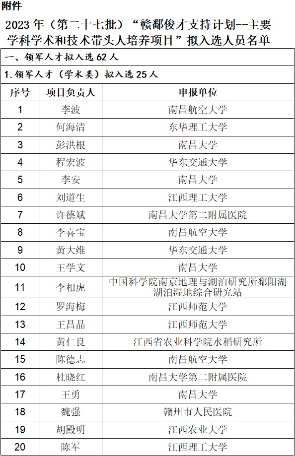 2023年度(第二十七批)赣鄱俊才支持计划--主要学科学术和技术带头人培养项目拟入选人员名单的公示