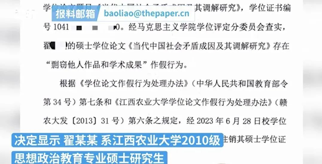 翟某某,系江西农业大学 2010 级思想政治教育专业硕士研究生学号 0202010030,于 2013年 12 月获江西农业大学法学硕士学位学位论文题目《当代中国社会矛盾成因及其调解研究》,学位证书编号 1041032013000290。经马克思主义学院学位评定分委员会查实翟某某的硕士学位论文《当代中国社会矛盾成因及其调解研究》存在剽窃他人作品和学术成果”作假行为。