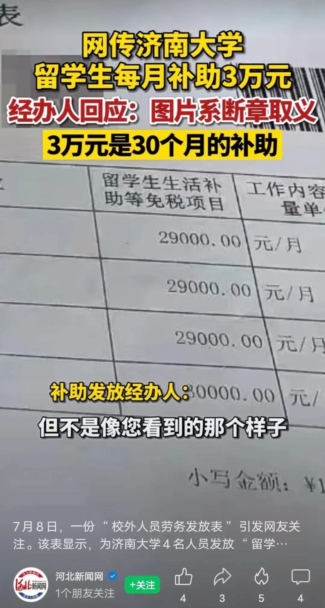 7月8日,一份“校外人员劳务发放表”引发网友关注。该表显示,为济南大学4名留学生人员发放“校外人员劳务”费用表显示,留学生7月省政府生活补助,三人是每人每月29000,一人是30000。