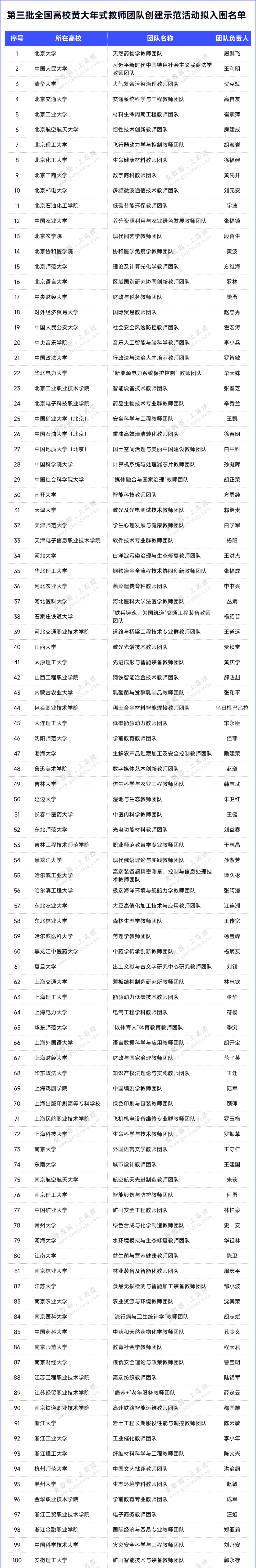 为学习贯彻党的二十大精神,贯彻落实习近平总书记对黄大年同志先进事迹的重要指示和给全国高校黄大年式教师团队代表的重要回信精神,以教师团队建设引导广大教师持续向黄大年同志学习,根据《教育部关于开展全国高校黄大年式教师团队创建活动的通知》(教师函〔2023〕2号),在部委院校申报、省级教育行政部门遴选推荐、专家评审基础上,拟确定第三批“全国高校黄大年式教师团队”,现进行公示。