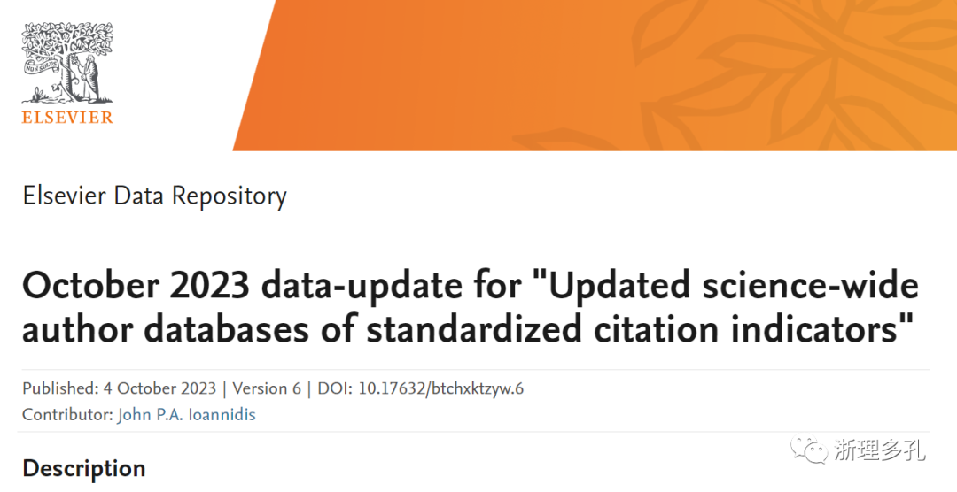 2023年10月4日,美国斯坦福大学(Stanford University)John P.A.Ioannidis教授团队发布的全球前2%顶尖科学家榜单(World's Top 2% Scientists)。更新了2023年版本,这也是该团队公布的第六版本(Version 6)。