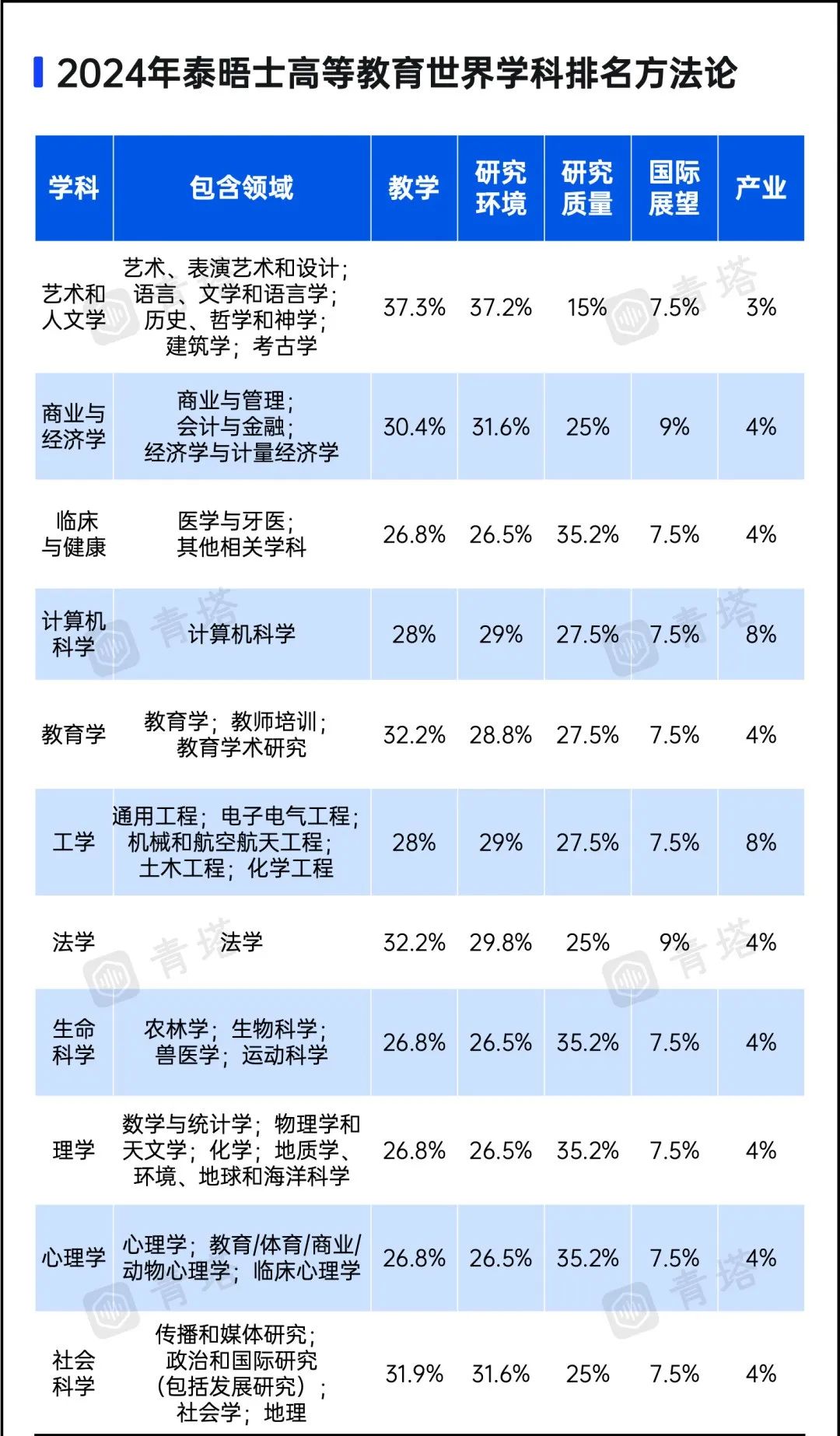 学科排名采用与 2024 年世界大学排名相同的 18 项表现指标,并汇总了教学、研究环境、研究质量、产业、国际展望五个类别下的分数。但整体方法论针对每个学科都进行了仔细的重新校准,并更改了权重以适应各个学科领域。特别是,对研究指标进行了更改,以更贴近每个学科的研究。