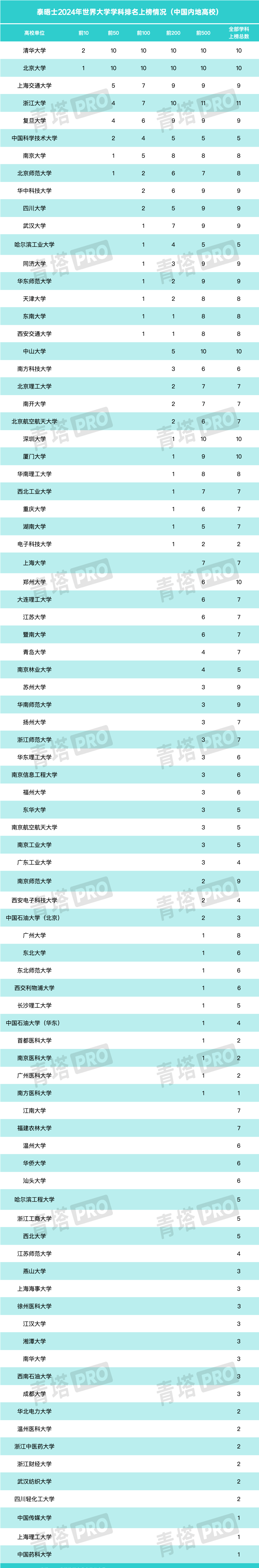 2024 年泰晤士高等教育世界大学学科排名中,中国内地共有 87 所高校 499 个学科上榜。