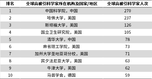 表2:2023年度全球高被引科学家上榜人次前十的机构