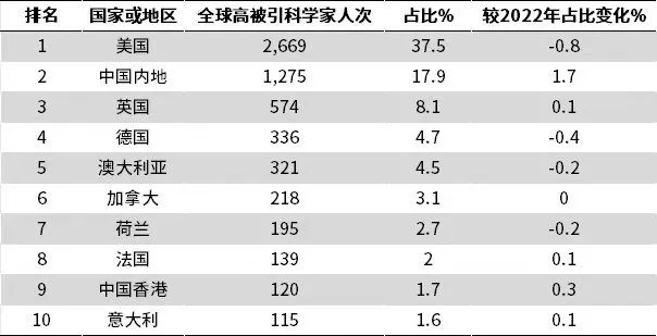 表1:2023年度全球高被引科学家上榜人次前十的国家或地区