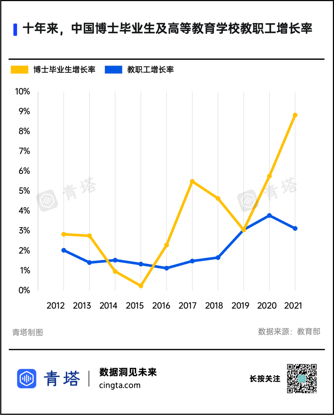 据教育部统计,2012年至2021年间,博士毕业生已经从5.1万增长到了7.2万,增幅39%;高等教育学校教职工则从22.7万增至27.8万,增长幅度为20%。
