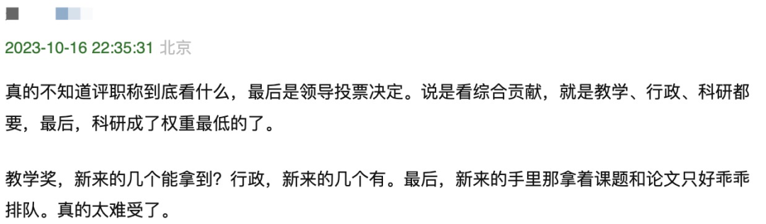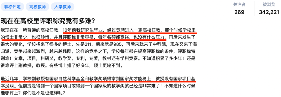 一位网友表示,自己十年前研究生毕业,经过竞聘进入高校任教,评职称非常容易,每年名额都宽裕。但随着学校招了很多985、211、中科院博士和海归派,竞争越来越激烈。