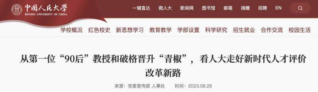 中国人民大学积极优化破格晋升通道,据学校介绍,今年8月出现了新世纪以来学校自评最年轻的、首位“90后”教授。