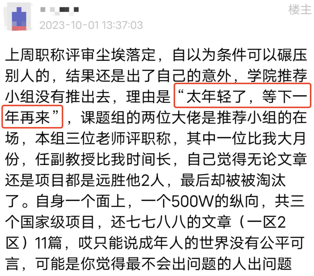 一位手握一个面上和一个500万纵向项目等3个国家级项目的青年教师,感慨自己在职称评选中落选的失意:评完后课题组长主动告知我“大家觉得你太年轻了,等下一年再来。”