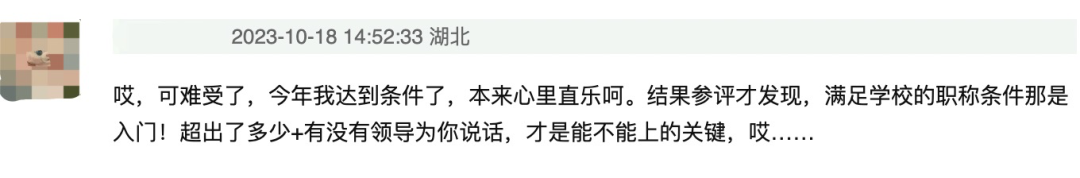 “今年我达到条件了,本来心里直乐呵。结果参评才发现,满足学校职称条件是入门!超出多少,加上有没有领导能为你说话,才是能不能评上的关键。”一位湖北高校的青椒苦恼道。