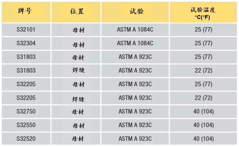 冲击试验的第二个方法即在比预期的使用温度更低的温度下评价母材、熔合区和热影响区,这可能是一种谨慎和具成本效益的方法。对于焊缝的评价,试验温度和合格标准必须针对具体的焊接类型并与使用条件结合。韧性将不会像固溶退火的双相不锈钢轧材那样高。焊缝金属较低的韧性不一定表明存在金属间相,而常常是由于氧含量增高造成的,特别是采用焊剂保护焊接工艺。