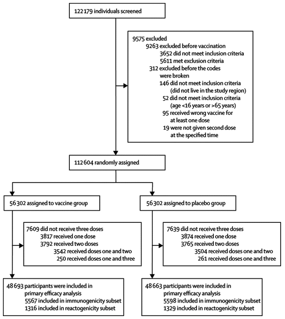 血清流行率数据表明,世界上有三分之一的人口感染了戊型肝炎病毒。而厦门大学夏宁邵教授等人进行了一项随机、双盲、安慰剂对照的3期试验以评估重组戊型肝炎疫苗HEV239的有效性和安全性。11165名试验参与者接受了戊肝病毒IgG检测,其中5285人(47%)戊肝病毒血清阳性。参与者被随机分配接种疫苗(n=56 302)或安慰剂(n=56 302)。48 疫苗组693名(86%)参与者和48名 安慰剂组663名参与者(86%)接种了三剂疫苗,并被纳入主要疗效分析。在接种第三剂后30天的12个月内,安慰剂组有15名参与者患上了戊型肝炎,而疫苗组则没有。三次接种后疫苗的有效性为100.0%(95%CI 72.1–100.0)。研究发现,可归因于疫苗的不良反应很少且轻微,且未发现与疫苗接种相关的严重不良事件。因此,HEV239在中国普通人群(包括16-65岁的男性和女性)中具有良好的耐受性,可有效预防戊型肝炎。