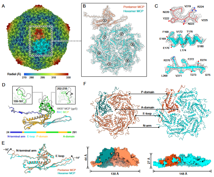 厦门大学夏宁邵教授/张锐教授/李少伟教授和Qingbing Zheng等人使用冷冻电镜(cryo-EM)和结构预测来确定噬菌体R4C衣壳的原子结构和尾部机械的原位结构,以表征独特的长刚性尾部。衣壳和尾管蛋白的分辨率可达到接近原子分辨率的3.63Å 和3.43 Å。通过重建门静脉适配器复合体的C12,作者表征了在其外围装饰辅助Ig样结构域的适配器结构。研究发现,尾管内负电荷分布的特定位置模式为先前确定的有助于DNA传输的棘轮机制提供了证据。此外,研究鉴定了一种吸收装置,其结构特征先前未报道用于其他噬菌体,但类似于荚膜红杆菌(RcGTA)的基因转移剂的噬菌体样颗粒。总的来说,该工作解决并深入探索了一种具有重要生态意义的siphophage的完整结构和DNA递送机制。
