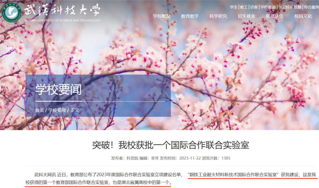 据武汉科技大学11月22日消息,“钢铁工业耐火材料新技术国际合作联合实验室”获批建设,这是该校获得的第一个教育部国际合作联合实验室,也是湖北省属高校中的第一个。