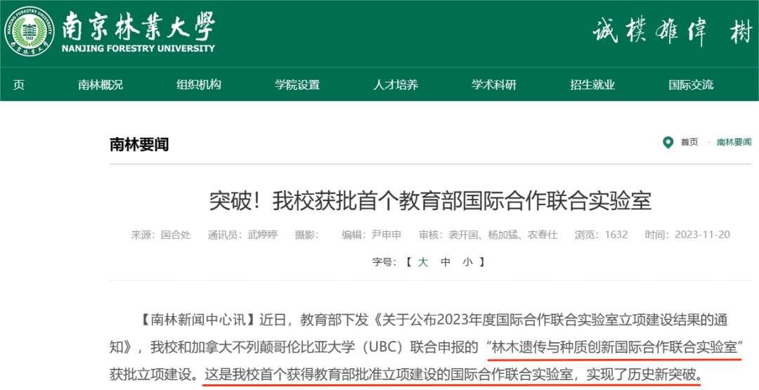 据南京林业大学新闻网11月20日消息,南京林业大学和加拿大不列颠哥伦比亚大学(UBC)联合申报的“林木遗传与种质创新国际合作联合实验室”获批立项建设。这是南京林业大学首个获得教育部批准立项建设的国际合作联合实验室,实现了历史新突破。