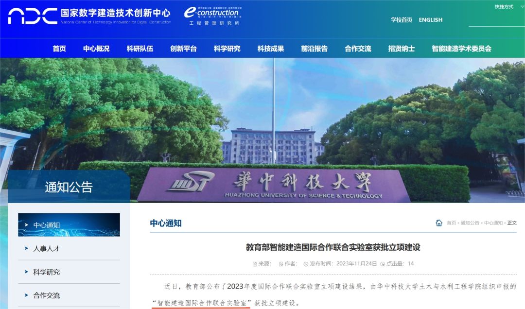 据华中科技大学国家数字建造技术创新中心消息,由华中科技大学土木与水利工程学院组织申报的“智能建造国际合作联合实验室”获批立项建设。