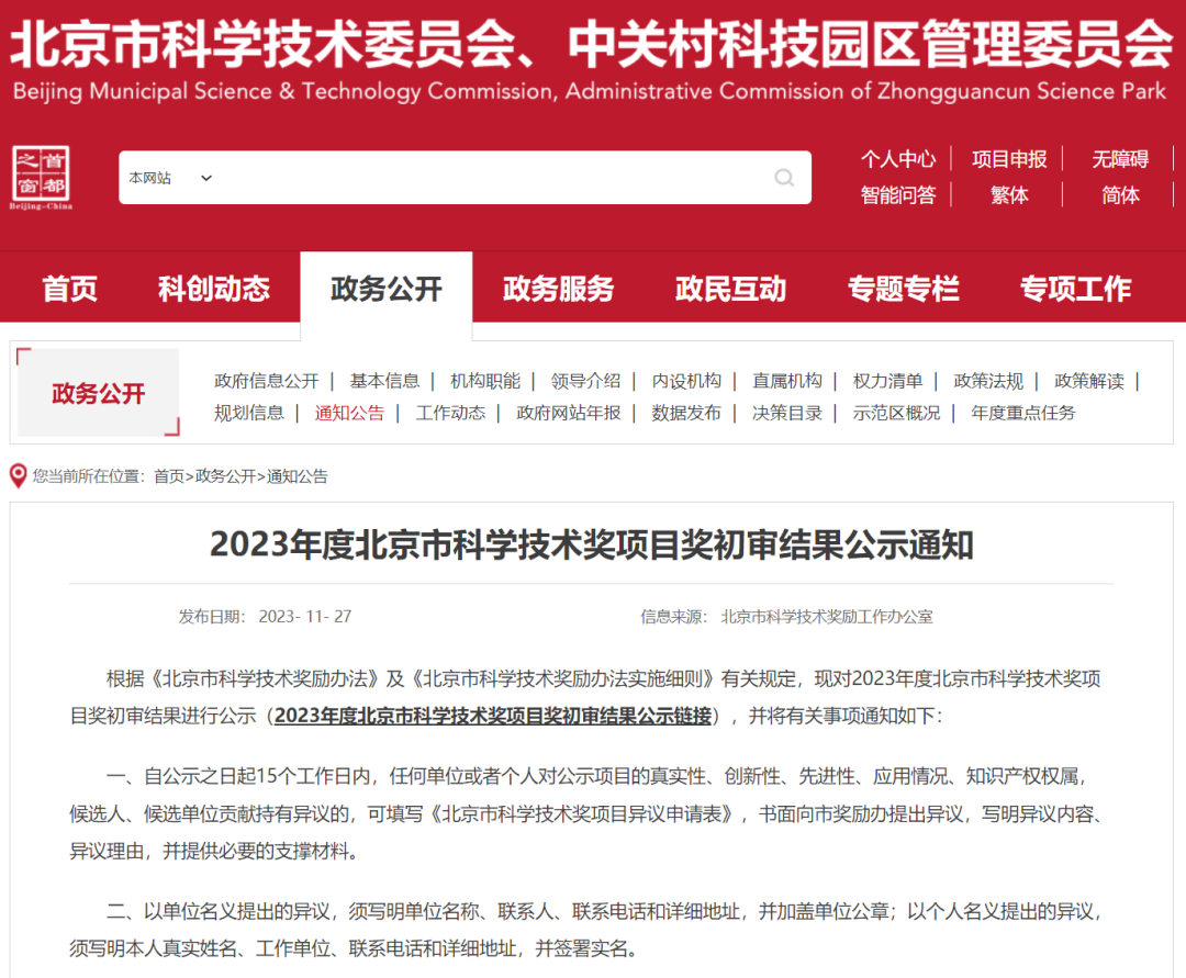 根据《北京市科学技术奖励办法》及《北京市科学技术奖励办法实施细则》有关规定,现对2023年度北京市科学技术奖项目奖初审结果进行公示(2023年度北京市科学技术奖项目奖初审结果公示链接),并将有关事项通知如下: