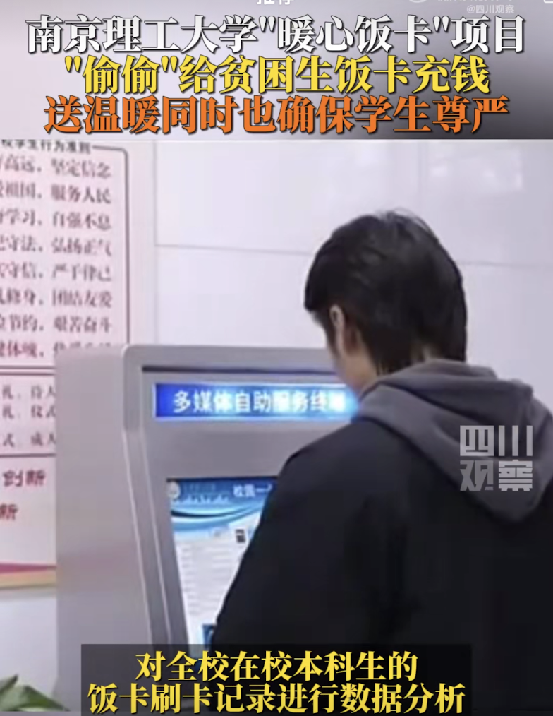 南京理工大学曾于2016年启动了“暖心饭卡”项目,对全校在校本科生的饭卡刷卡记录进行数据分析,每个月在食堂吃饭超过60顿、一个月总消费不足420元的,被列为受资助对象,每个月将收到补助,直到毕业。