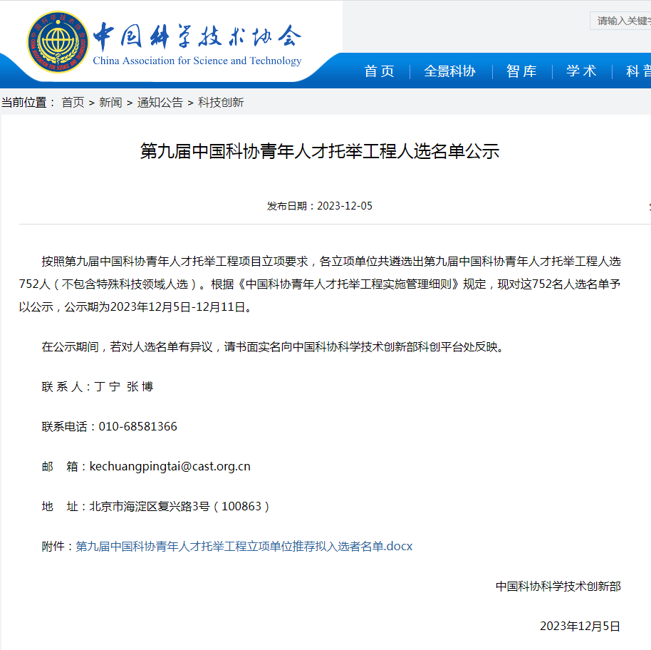 75人新名单发布!2023年中国科协“青年人才托举工程”最