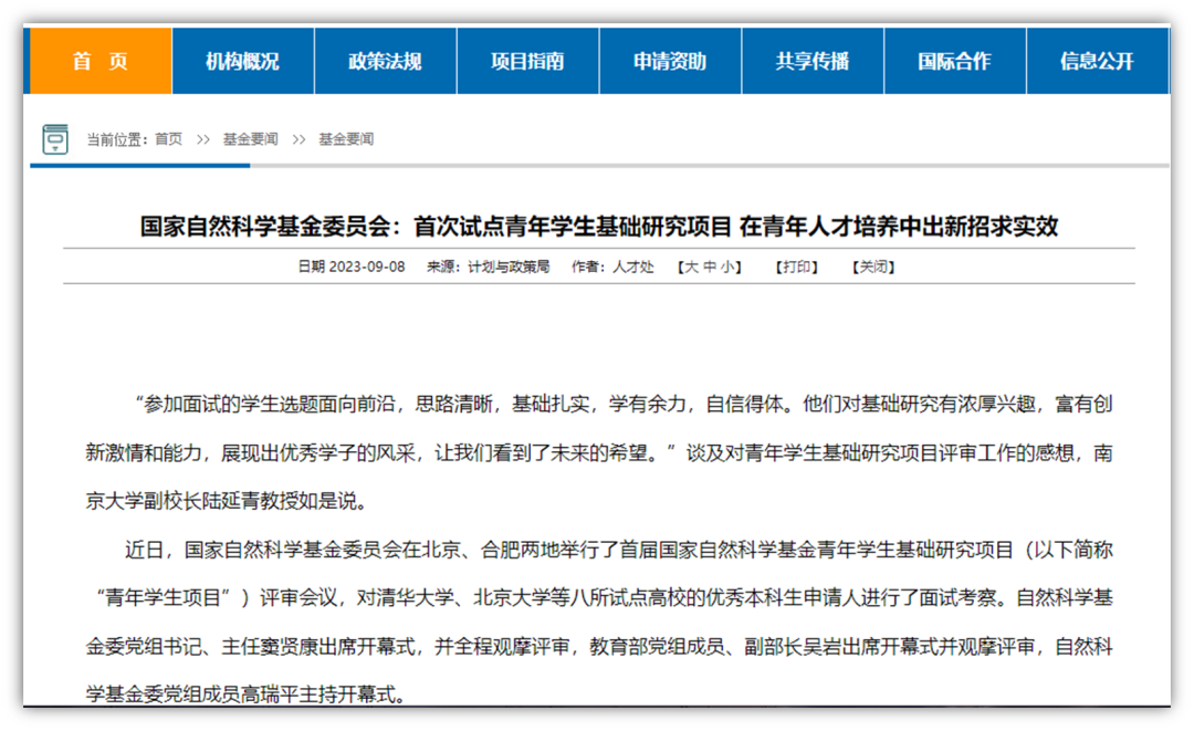 2023年5月,自然科学基金委形成设立青年学生项目的初步构想。6月,窦贤康带队先后前往清华大学、北京大学等八所高校进行调研,与各高校主要负责同志、科研人员、学生及管理人员代表围绕进一步加强对青年人才支持开展深入交流。7月,正式启动青年学生项目,组织试点高校推荐申请。8月,组织会议评审择优遴选。